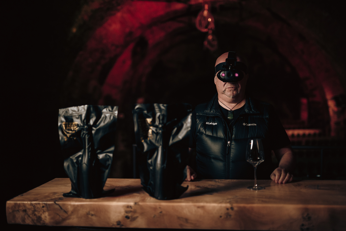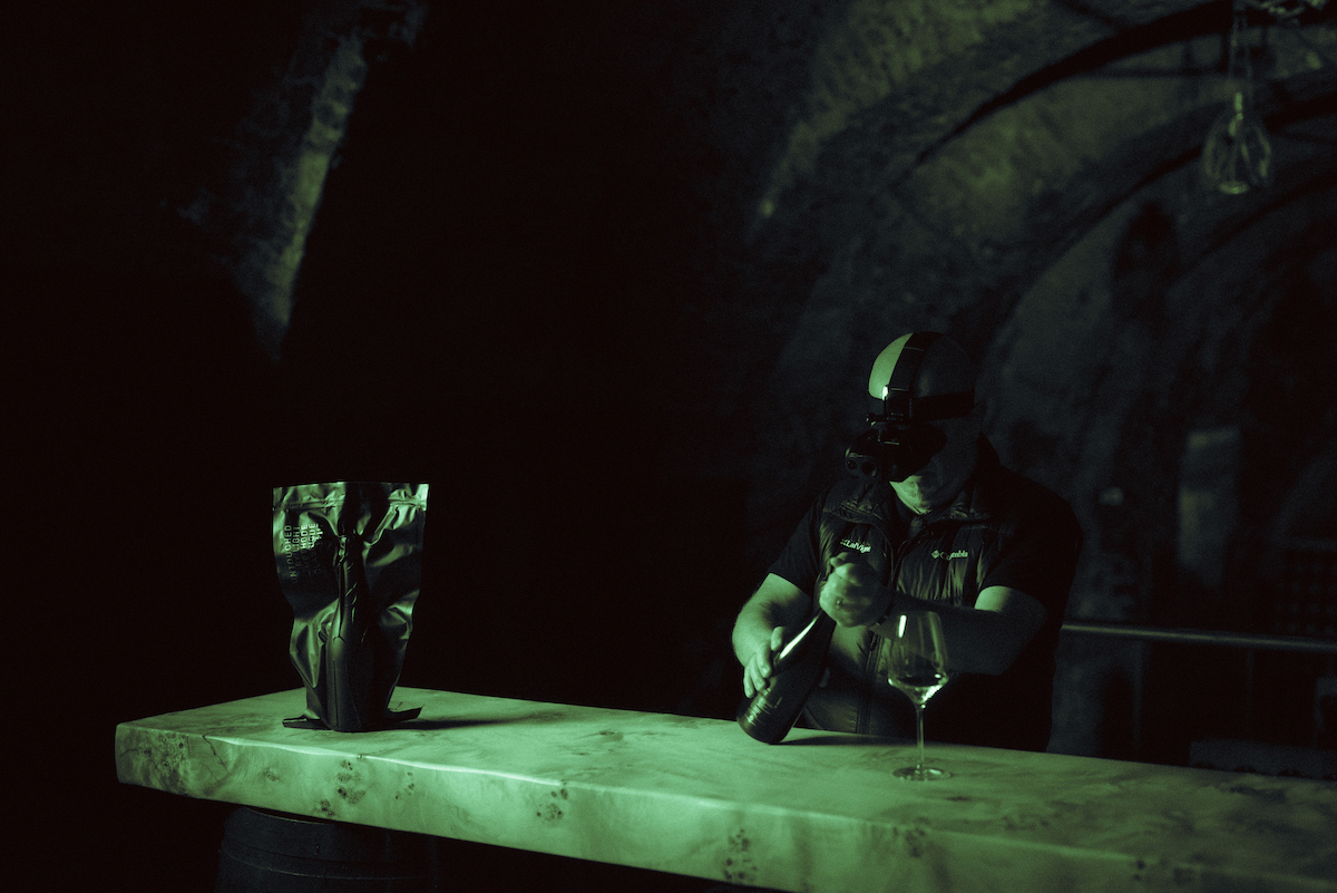 We used thermal cameras during the tasting in the cave for guests to be able to follow the event online. The thermal cameras showed the sommelier who was explaining how to open, serve and taste the wine in complete darkness. The sommelier and the hostesses wore military night vision goggles to be able to see, open, taste and serve the sparkling wine to guests on the spot.