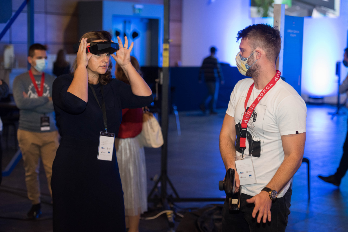 Once we made all adjustments according to epidemiological restrictions, execution of the event went by plan. Event was set up in a grand, empty conference space that needed a lot of scenography solutions to make space interesting and engaging. Whole scenography was divided into three main sectors – exhibition, conference, and networking. Outside of the main space we set press corner and registration point. Building of the scenography and technical rehearsal were done the day before. Also, large exhibits were set in the space the day before. Guests were able to register for the event via web page form and only pre-registered guests were able to enter the event. From epidemiological point of view, it was important that no more than 100 people was at the event at one point. In total team of 12 people worked on technical and logistical execution of the event. Event started with panel discussion that was held on the main stage. After that, media representatives had their slots to take statements form the panel participants and exhibitors. The rest of the time, guests were touring the exhibition and networking. Event started at 10 AM and ended at 4 PM.