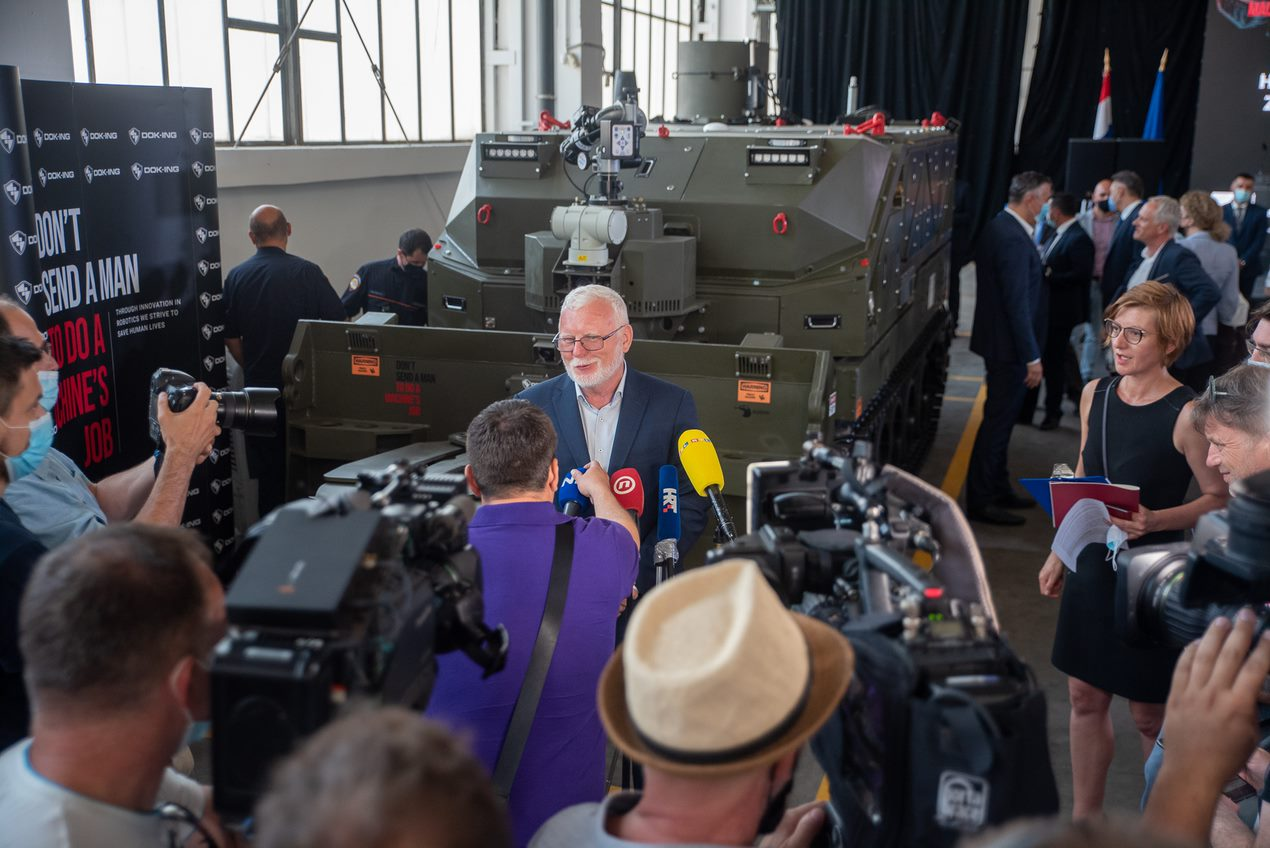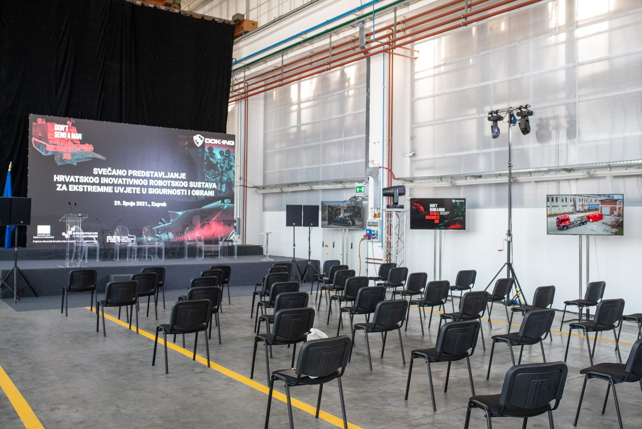 DOK-ING is a global leader in development and production of robotic systems for special purposes. With this event they wanted to introduce an innovative robotic remote-control system for operation in extreme conditions; it is a unique machine that can operate in conditions of open fire, explosion, collapse, high concentrations of explosive and toxic substances. Guests at the event were business partners, suppliers, government representatives and media. It was an event for 70 people. Goal was also to start with the stronger positioning of DOK – ING on Croatian market. Event was organized in one of the DOK – ING’s production halls and for this purpose the whole space needed to be reorganized and transformed. At the arrival, guests were registered according to epidemiological restrictions. First part of the event was the official part, with welcome speeches, followed by robot presentation – the most attractive part of the event. Reveal of the machine attracted great attention of guests, especially media. The break in the program was used for statements, short interviews with company representatives and photographing. After the break program continued with panel discussion with the topic „Opportunities for the Croatian Defence Industry in the Upcoming Financial Period of the European Union”. Panel discussion was followed by networking part – catering was served, and guests mingle, took photos by the presented machine. At their leave guests got goodie bags.