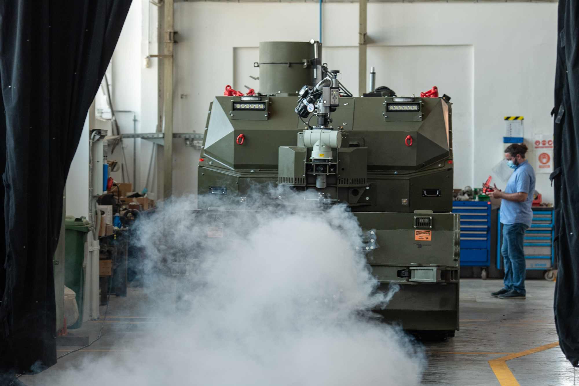 Since this event was for the guests on a high level of management and government positions, the whole atmosphere of the event was ought to be quite serious, with strict protocols. Therefore, we wanted to make presentation of the robot attractive and memorable. We organized it as a premier drive. Robot was hidden behind the black curtain and at the reveal moment an operator started the 17-ton heavy machine, curtain was open, we released the fog, all the lights were pointed at the robot, and it made its first public drive through the secured corridor, right next to the sitting guests, featured by the intro music from The Warriors movie. Premiere was a success, because we couldn’t keep our guests on their seats, especially media representatives.