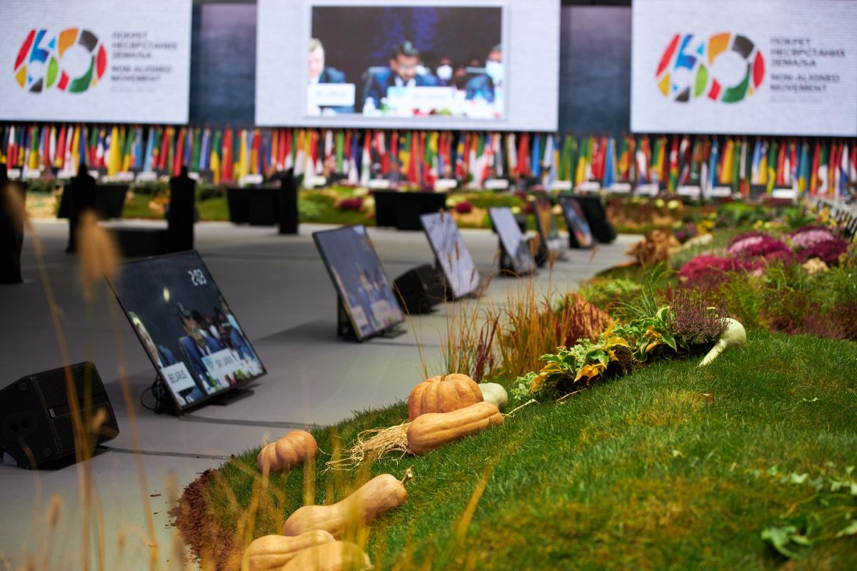 The event was officially opened with an audio-visual spectacle: an integrated animation broadcast via mapping on the floor in the central part of the hall, on four large LED screens and to a special installation above the delegate table made of transparent LED screens. Art direction was based on the motifs of water colors, which are melted and changed colors evoked the story of the origin of the Non-Aligned Movement, its history and symbols, as well as its goals which they aspire to in the future. The impressive installation in the main hall attracted special attention hall, on an area of as much as 220 square meters. The installation consisted of living nature full of flowers and greenery, which symbolize Serbian landscapes.