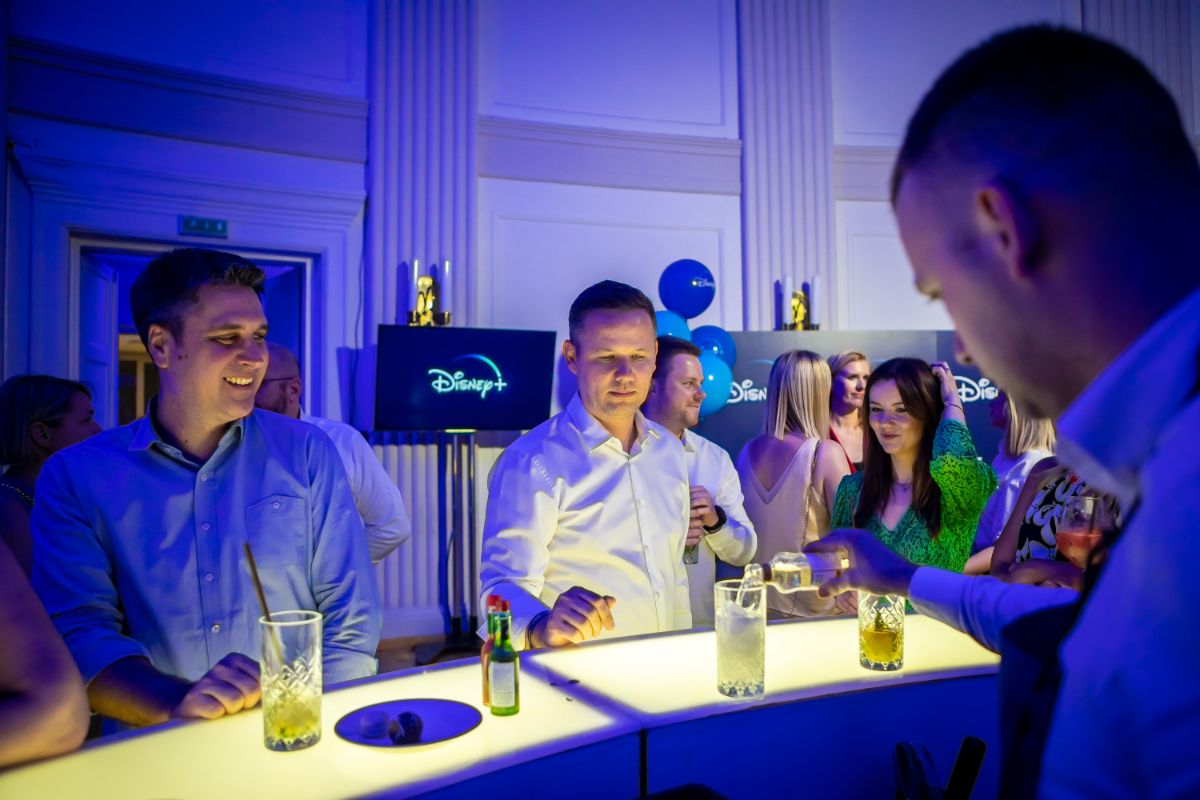 Organization of the launch required a lot of preparation and agreements and started a few months before the event itself. Preparations like choosing the location, creating a concept and defining goals started 3 months before, while on-site setup started the day before. During the evening, 3D mapping was displayed every 10 minutes on the walls of the museum showing famous characters that will be available on Disney+. We placed transparent domes designed as living room spaces where visitors could come and sit, rest, watch the content and socialize while hostesses showed the Disney+ service. From 8pm guests gathered at the Croatian Journalists’ Association, where they were greeted by a new interior decorated in Disney+ colors, and a branded press wall. Guests were welcomed by hosts, finger food was served, and there was a large cocktail bar. Guests could watch the content of the new platform on a large video wall and 6 plasma walls. Disney+ packages were distributed upon departure.
