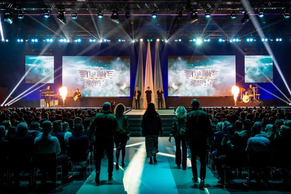 The event was built as an elite training environment shaped through a collaborative workshop process, where employees helped define the purpose and content. The concept unfolded in three connected chapters: a daytime academy with tailored learning sessions, an evening graduation celebrating team spirit, and a five‑week sales competition that extended the energy beyond the event. With a bold Top Gun‑inspired aesthetic, the experience blended learning, recognition, and entertainment into one cohesive journey.