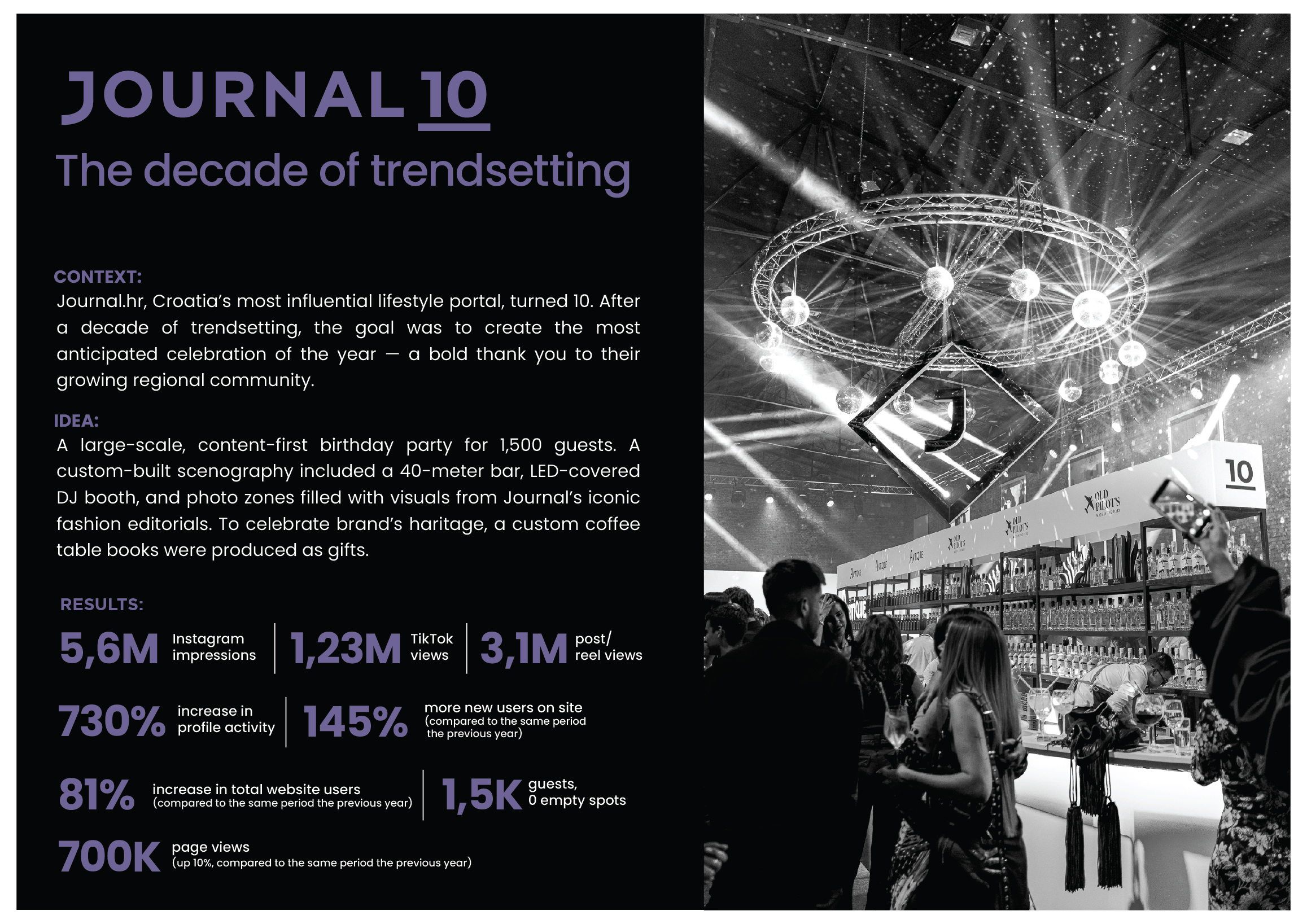 In the Crossover category, which celebrates events that blend formats, audiences, and disciplines into a single hybrid experience, Alert Agency won third place with Journal 10 – Anniversary, a large‑scale celebration marking a decade of Croatia’s leading lifestyle media brand.