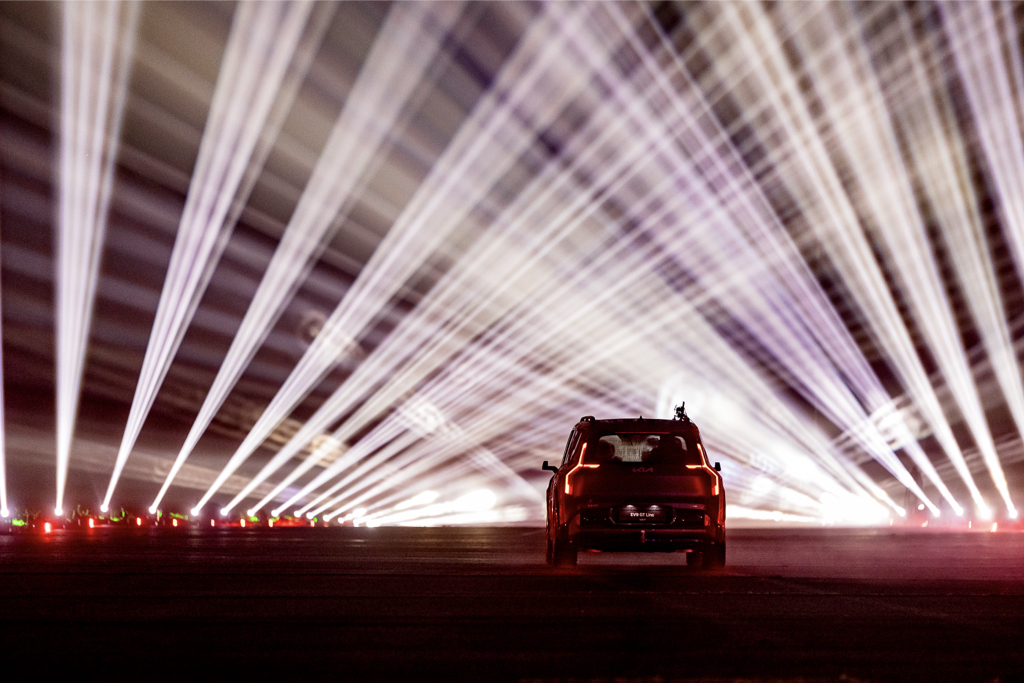 The guests had no idea the launch would take place at the Grądy Airport. They took part of regular b2b/media conference in hotel. In the end of this part, the President of Kia informed the attendees that they would be picked up at the hotel.They finally reached the Grądy Airport. They could not yet see the landing strip, the LED screen, or the lights. They were invited into the transparent tent for a drink. Soon after, we asked everyone to come outside and make their way down the airstrip to the grandstand. While walking for more than 100 meters, they noticed an unusual projection on the forest wall. They saw a giant swimming sea turtle, a surfer or butterflies. Then, they were shown an about 7-minute film presenting Kia’s dedication to eco-friendly practices. The film was projected in total darkness. The show: First, a countdown, then a 3.5-minute spectacle amid a row of lights. The car moved in the planned sequences, gliding down the entire runway like a fashion model on a catwalk.