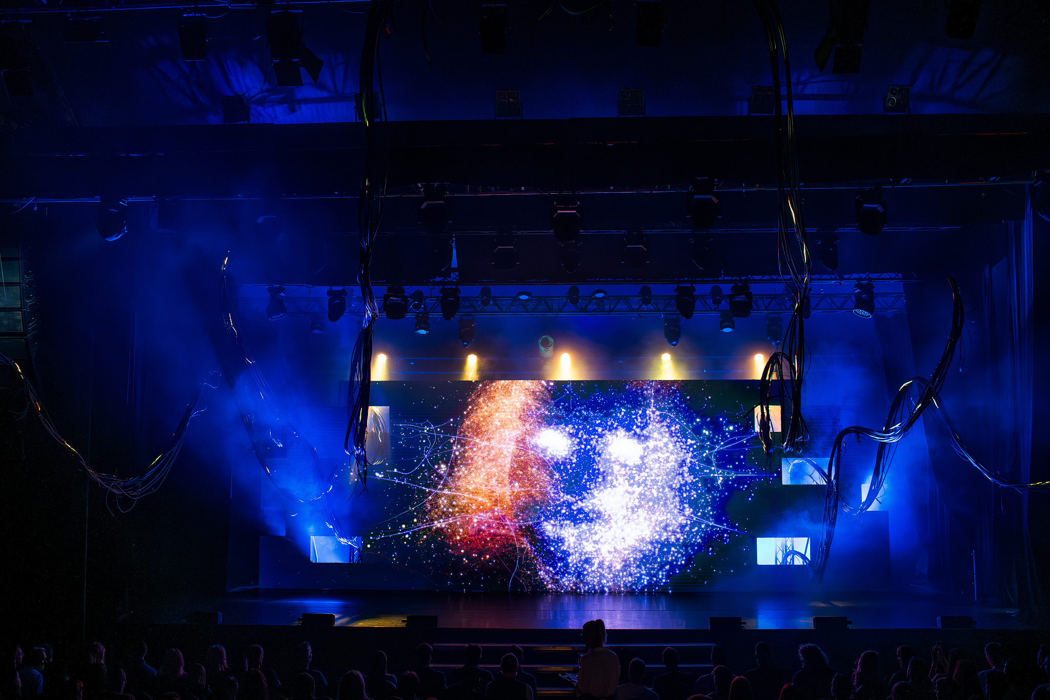 During the time of our creation process, AI was still a foreign tool, which everyone was afraid of and could not properly work with. We decided to use it in every part of the creation process and so the long hours of editing, writing prompts and dividing the answers began. We luckily had a team of professionals selected specifically for this whole process, so we would truly stick to our word and try to symbiotically create an event, which would rewrite the whole negative idea about AI and creative industry. And so we did. Another challenge that came with common responsibility towards our planet and climate- we set ourselves a goal to make this event as sustainable as possible. That is the most important thing we were thinking about when designing the scenography- we used old cables collected all around Slovakia, recycled and used specifically for this event. Even now, long after the event happened, these cables are being used as a part of installation in Slovak National Gallery.
